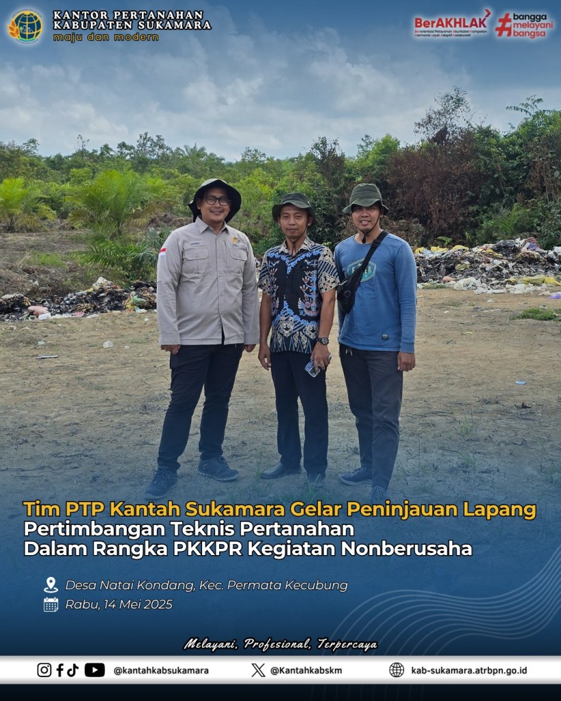 Pada Rabu (14/05/2025), Kantor Pertanahan Kabupaten Sukamara melalui Tim Pertimbangan Teknis Pertanahan (PTP) telah melaksanakan Peninjauan Lapang dalam rangka penerbitan PTP Kegiatan Persetujuan Kesesuaian Kegiatan Pemanfaatan Ruang (PKKPR) Nonberusaha oleh Pemerintah Desa Natai Kondang untuk pembangunan Tempat Pengolahan Sampah Reduce, Reuse, Recycle (TPS3R).