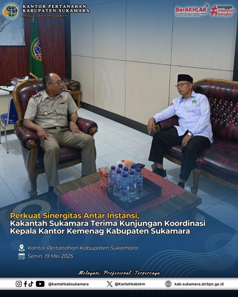 Pada Senin (19/05/2025), Kepala Kantor Pertanahan Kabupaten Sukamara, Irwandi, S.H., M.H. menerima kunjungan koordinasi dari Kepala Kementerian Agama Kabupaten Sukamara, Drs. H. Misbah, MA dalam rangka proses balik nama sertipikat yang digunakan untuk kepentingan layanan keagamaan, seperti madrasah dan fasilitas pendidikan lainnya.