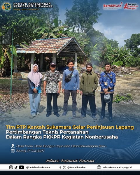 Pada Kamis (17/07/2025), Kantor Pertanahan Kabupaten Sukamara melalui Tim Pertimbangan Teknis Pertanahan (PTP) telah melaksanakan Peninjauan Lapang terhadap 3 bidang tanah dalam rangka penerbitan PTP Persetujuan Kesesuaian Kegiatan Pemanfaatan Ruang (PKKPR) Kegiatan Nonberusaha oleh Pemerintah Kabupaten Sukamara CQ. Dinas Lingkungan Hidup Kabupaten Sukamara yang penggunaannya untuk Pusat Olah Organik (POO) dan 2 lokasi lainnya untuk Tempat Pengolahan Sampah Reduce Reuse Recycle (TPS 3R).