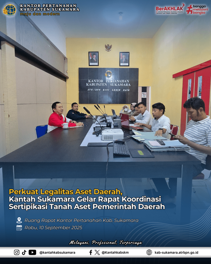 Pada Rabu (10/9/2025) Kantor Pertanahan Kabupaten Sukamara telah menggelar Rapat Koordinasi Sertifikasi Tanah Aset Pemerintah Daerah sebagai langkah strategis dalam mempercepat legalisasi aset milik Pemerintah Daerah yang tersebar di berbagai wilayah Kabupaten Sukamara.