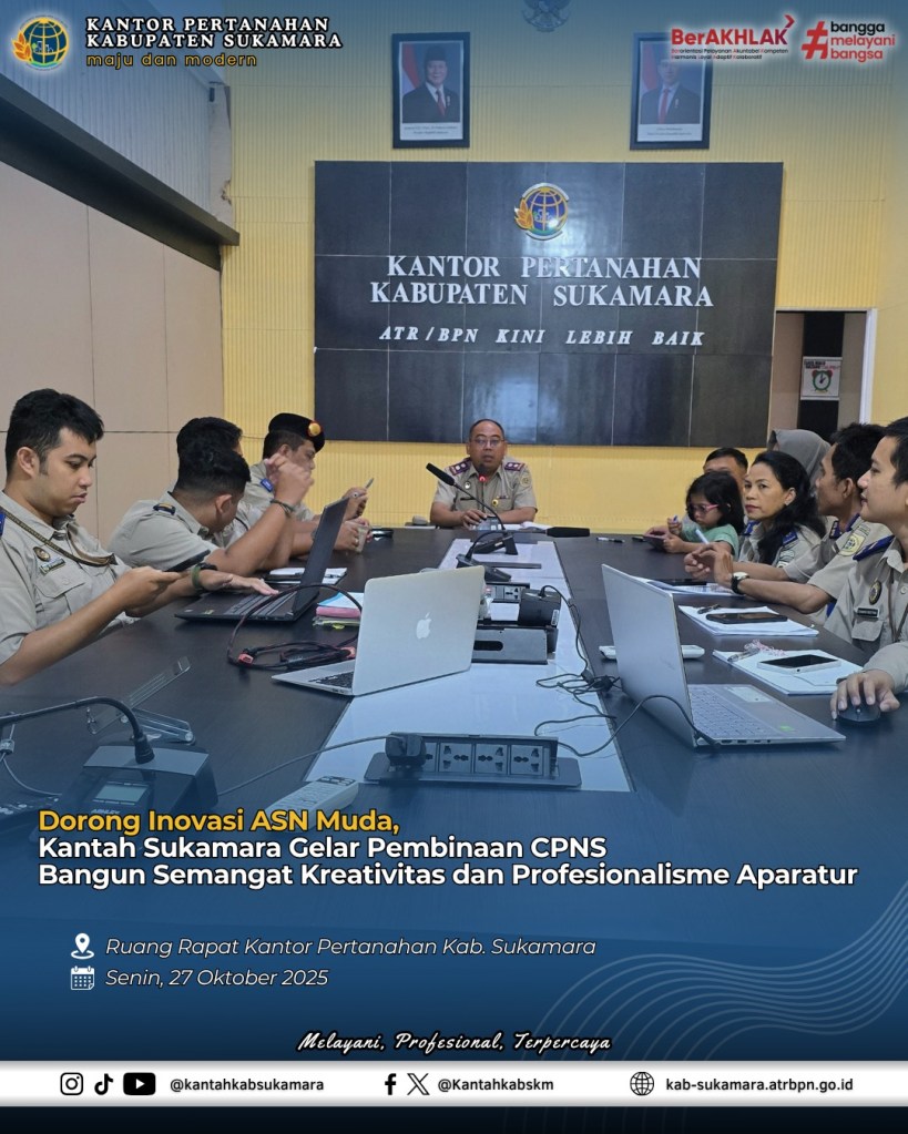 Kantor Pertanahan Kabupaten Sukamara melaksanakan kegiatan Evaluasi Internal Rancangan Aktualisasi Inovasi Layanan Pertanahan yang disampaikan oleh para Calon Pegawai Negeri Sipil (CPNS) pada Senin (27/10/2025). Kegiatan ini menjadi bagian dari proses pembinaan dan pengembangan kompetensi aparatur muda untuk membentuk ASN yang inovatif, berintegritas, dan berorientasi pada pelayanan publik.