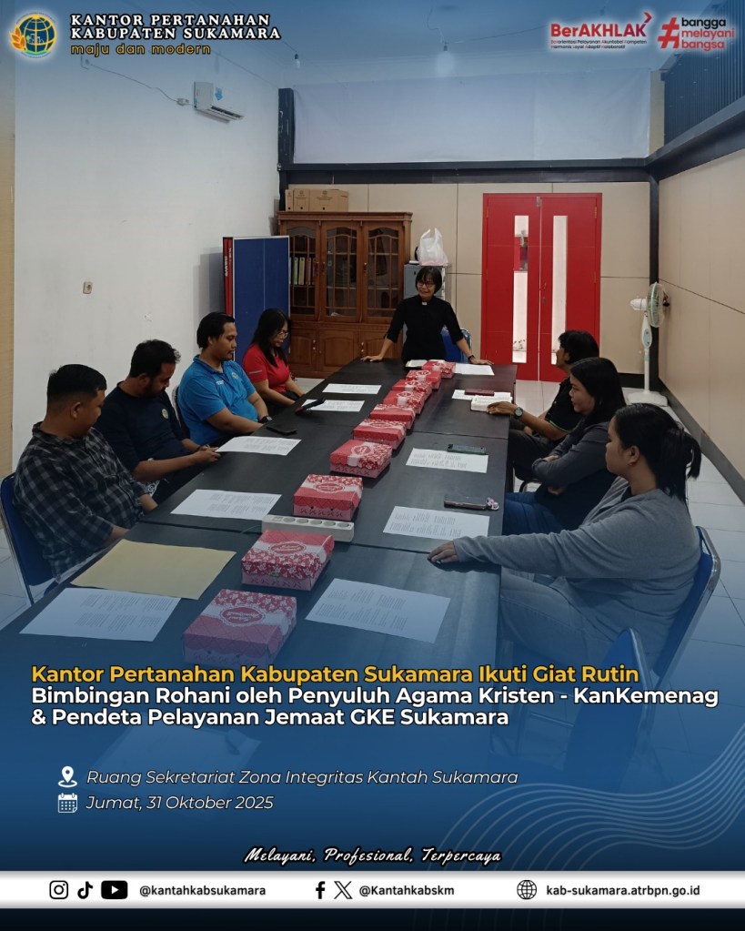 Dalam upaya mendukung pembinaan mental dan spiritual pegawai, Kantor Pertanahan Kabupaten Sukamara menerima kunjungan Penyuluh Agama Kristen dari Kantor Kementerian Agama Kabupaten Sukamara dan Pendeta Pelayanan Jemaat GKE Sukamara yang melaksanakan kegiatan Bimbingan Rohani bagi para pegawai pada Jumat (31/10/2025). Kegiatan yang berlangsung di Ruang Sekretariat Zona Integritas Kantah Sukamara ini merupakan bagian dari pembinaan keagamaan yang berkelanjutan, bertujuan untuk meningkatkan keimanan dan spiritualitas para pegawai.
