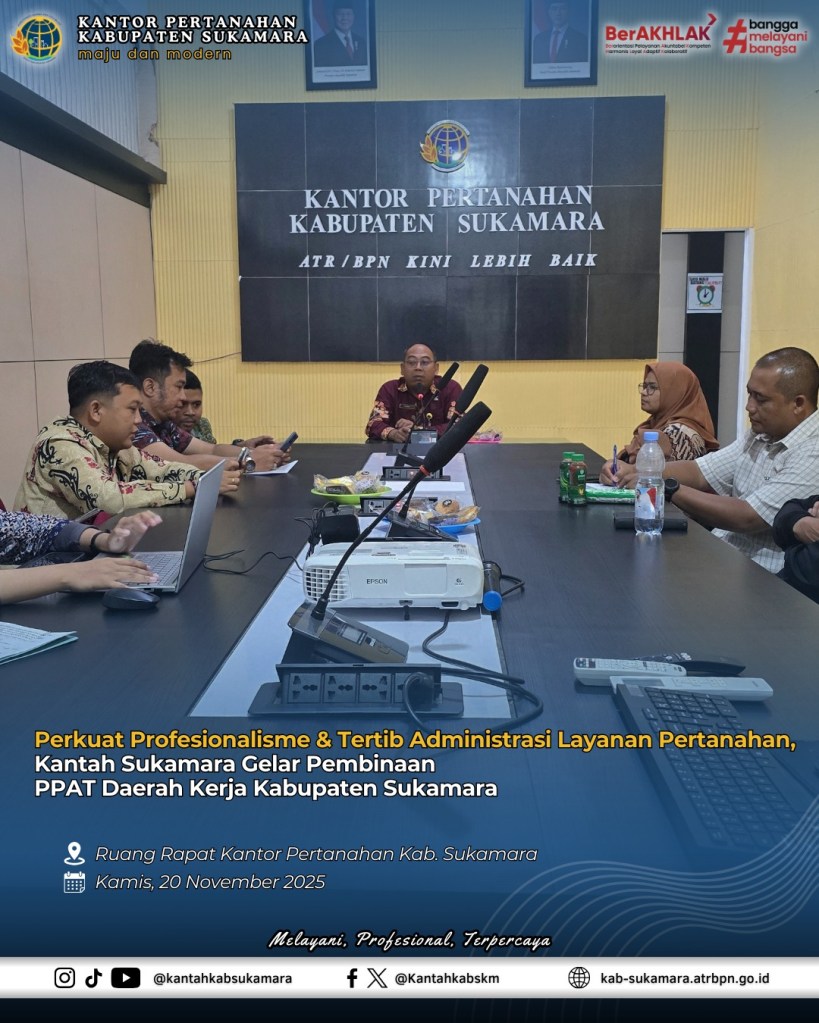 Pada Kamis (20/11/2025) Kantor Pertanahan Kabupaten Sukamara telah melaksanakan kegiatan Pembinaan Pejabat Pembuat Akta Tanah (PPAT) yang bertugas di wilayah Kabupaten Sukamara sebagai bagian dari upaya meningkatkan kualitas penyelenggaraan layanan pertanahan dan memastikan pelaksanaan tugas PPAT berjalan sesuai ketentuan peraturan perundang-undangan. Bertempat di Ruang Rapat Kantor Pertanahan, adapun rapat dipimpin langsung oleh Kepala Kantor Pertanahan (Kakantah) Kabupaten Sukamara, Irwandi, S.H., M.H., dan dihadiri oleh PPAT Daerah Kerja Sukamara, jajaran Pejabat Pengawas dan Pejabat Fungsional.