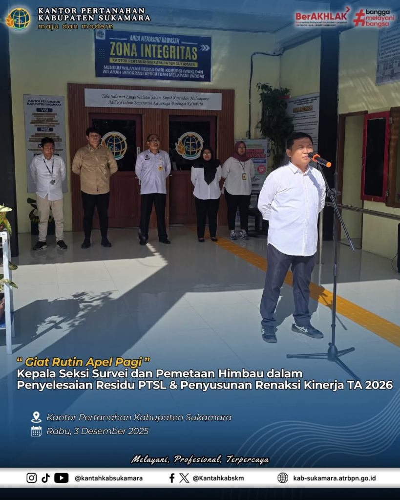 Pada Rabu (3/12/2025) Kantor Pertanahan Kabupaten Sukamara telah melaksanakan Apel Pagi rutin sebagai sarana konsolidasi internal dalam rangka memperkuat semangat, disiplin, dan arah kebijakan internal bagi seluruh pegawai. Adapun kegiatan Apel Pagi dipimpin langsung oleh Kepala Seksi Survei dan Pemetaan (Kasi SP), Ryan Adittya, S.Tr. dan diikuti oleh seluruh pegawai dengan amanat utama terkait penyelesaian residu PTSL dan penyusunan target kinerja dan strategi pelaksanaan kegiatan tahun 2026.