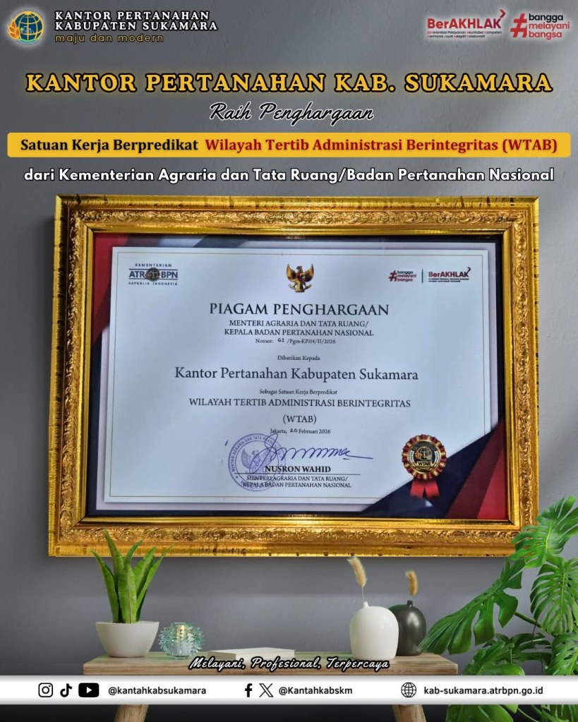 Kantor Pertanahan Kabupaten Sukamara berhasil meraih Penghargaan Wilayah Tertib Administrasi Berintegritas (WTAB) Tahun 2026 dari Kementerian Agraria dan Tata Ruang/Badan Pertanahan Nasional.