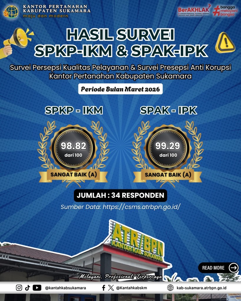 Halo #sobATRBPN Sukamara 👋✨ Dalam rangka mendukung tugas Kementerian Agraria dan Tata Ruang/Badan Pertanahan Nasional dalam menyelenggarakan urusan pemerintahan, serta memberikan pelayanan publik yang berkualitas, maka berdasarkan amanat Pasal 38 Undang-Undang (UU) Nomor 25 Tahun 2009 tentang Pelayanan Publik serta Peraturan Menteri Pendayagunaan Aparatur Negara dan Reformasi Birokrasi (Permen PAN-RB) Nomor 14 Tahun 2017 tentang Pedoman Penyusunan Survei Kepuasan Masyarakat, Kantor Pertanahan Kabupaten Sukamara bertanggung jawab melaksanakan kegiatan Survei Kepuasan Masyarakat melalui Survei Persepsi Kualitas Pelayanan (SPKP/IKM) & Survei Presepsi Anti Korupsi (SPAK/IPK). Kegiatan survei ini bertujuan untuk mengukur tingkat kepuasan masyarakat sebagai pengguna layanan dan merupakan upaya dalam meningkatkan kualitas penyelenggaraan pelayanan publik. Adapun berdasarkan Hasil Survei periode Maret 2026, diperoleh nilai SPKP/IKM : 98.82/100 dan nilai SPAK/IPK : 99.29/100 dengan total responden sejumlah 34 pengguna layanan. Terima kasih atas penilaian yang diberikan. Penilaian ini menjadi bahan perbaikan kualitas layanan bagi kami Kantor Pertanahan Kabupaten Sukamara sehingga dapat memberikan pelayanan yang prima dan terbaik kepada seluruh Pengguna Layanan. #IKM #IPK #PelayananPublik #ZonaIntegritas #KantahSukamara #BPNSukamara #ATRBPNKiniLebihBaik #ATRBPNMajudanModern #MelayaniProfesionalTerpercaya