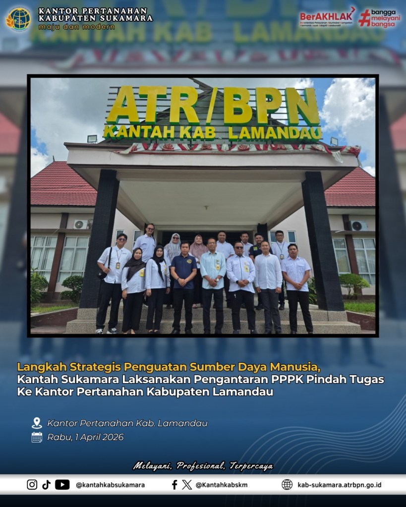 Halo #sobATRBPN Sukamara 👋✨ Kantor Pertanahan Kabupaten Sukamara melaksanakan kegiatan pengantaran Pegawai Pemerintah dengan Perjanjian Kerja (PPPK) yang pindah wilayah tugas ke Kantor Pertanahan Kabupaten Lamandau sebagai bagian dari proses penataan dan penguatan sumber daya manusia di lingkungan Kementerian ATR/BPN pada Rabu (1/4/2026). Kegiatan pengantaran tersebut diwakili oleh Kepala Seksi Penetapan Hak dan Pendaftaran serta Koordinator Kelompok Substansi Kantor Pertanahan Kabupaten Sukamara, yang secara langsung mengantarkan sebanyak 2 (dua) pegawai ke unit kerja yang baru. Kunjungan rombongan diterima oleh Kepala Kantor Pertanahan Kabupaten Lamandau, Sugeng Haryanto, S.SiT. Dalam suasana penuh kehangatan dan kekeluargaan, kegiatan ini diawali dengan pengarahan dan dilanjutkan pengenalan diri oleh masing-masing pegawai PPPK, sebagai bentuk awal adaptasi dan perkenalan di lingkungan kerja yang baru. Pada kesempatan tersebut, disampaikan harapan agar para PPPK yang akan berpindah tugas dapat segera bertugas dan nantinya mampu beradaptasi dengan lingkungan kerja yang baru serta terus menunjukkan kinerja yang profesional, berintegritas, dan bertanggung jawab dalam mendukung pelaksanaan tugas dan pelayanan pertanahan kepada masyarakat. Kegiatan ini juga mencerminkan komitmen Kantor Pertanahan Kabupaten Sukamara dalam memastikan proses mutasi pegawai berjalan dengan baik, tertib, dan tetap menjunjung tinggi nilai-nilai kebersamaan serta profesionalitas aparatur. Diharapkan, sinergi antar satuan kerja dapat terus terjalin dengan baik guna mendukung peningkatan kualitas pelayanan publik di bidang pertanahan. #PindahWilayahTugas #PPPK #PelayananPublik #KantahSukamara #BPNSukamara #ATRBPNKiniLebihBaik #ATRBPNMajudanModern #MelayaniProfesionalTerpercaya