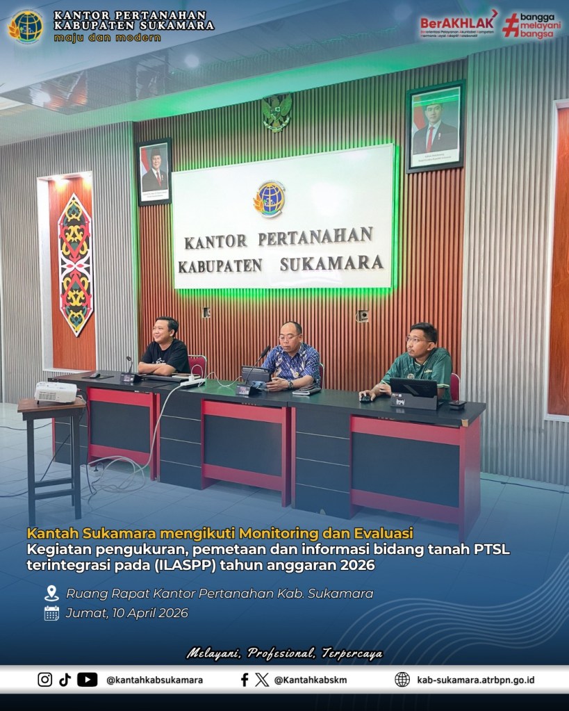 Halo #sobATRBPN Sukamara 👋✨ Kantor Pertanahan Kabupaten Sukamara turut mengikuti rapat monitoring & evaluasi kegiatan pengukuran, pemetaan dan informasi bidang tanah PTSL terintegrasi pada Integrated Land Administration and Spatial Planning Project (ILASPP) tahun anggaran 2026 pada Jumat (10/4/2026). Rapat monitoring & evaluasi ini dipimpin langsung oleh Sekretaris Direktorat Jenderal Survei dan Pemetaan Pertanahan dan Ruang. Rapat ini menjadi langkah strategis dalam memastikan optimalisasi, pelaksanaan kegiatan berjalan sesuai dengan target dan ketentuan yang berlaku. #KantahSukamara #BPNSukamara #ATRBPNKiniLebihBaik #ATRBPNMajudanModern #MelayaniProfesionalTerpercaya