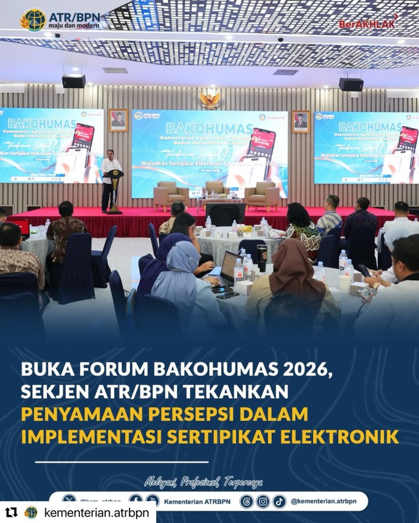 Halo #SobATRBPN, Sekretaris Jenderal Kementerian ATR/BPN, Dalu Agung Darmawan, membuka Forum Badan Koordinasi Hubungan Masyarakat (Bakohumas) Tahun 2026 yang digelar di Jakarta, Rabu (15/04/2026). Forum ini menjadi wadah untuk memperkuat sinergi dan menyamakan persepsi antarinstansi dalam mendukung implementasi layanan pertanahan berbasis digital. Dalam kesempatan tersebut, dibahas penerapan Sertipikat Elektronik dan pemanfaatan aplikasi Sentuh Tanahku sebagai bagian dari transformasi layanan publik yang lebih modern, transparan, dan efisien. Peran humas dinilai sangat penting dalam menyampaikan informasi kepada masyarakat agar semakin memahami manfaat layanan digital yang dikembangkan Kementerian ATR/BPN. Melalui forum ini, diharapkan para insan humas dapat menjadi penghubung informasi yang adaptif dan responsif, sekaligus mendorong masyarakat untuk beralih ke layanan pertanahan berbasis elektronik. Yuk kunjungi selengkapnya di: https://www.atrbpn.go.id/berita/buka-forum-bakohumas-2026-sekjen-atrbpn-tekankan-penyamaan-persepsi-dalam-implementasi-sertipikat-elektronik #KementerianATRBPN #MelayaniProfesionalTerpercaya #MajuDanModern #MenujuPelayananKelasDunia