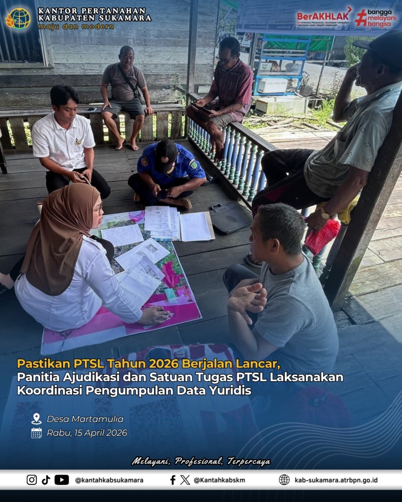 Halo #sobATRBPN Sukamara 👋✨ Dalam rangka menyukseskan pelaksanaan Pendaftaran Tanah Sistematis Lengkap (PTSL) Tahun Anggaran 2026, Kantor Pertanahan Kabupaten Sukamara melaksanakan kegiatan koordinasi pengumpulan data yuridis yang berlokasi di Desa Kartamulia pada Rabu (15/4/2026). Adapun kegiatan dilaksanakan oleh Panitia Ajudikasi, Satuan Tugas Fisik dan Satuan Tugas Yuridis PTSL Kantor Pertanahan Kabupaten Sukamara. Kegiatan ini menjadi salah satu tahapan penting dalam pelaksanaan PTSL, khususnya untuk memastikan kelengkapan dokumen pendaftaran, kesesuaian data subjek dan objek, serta validitas informasi yuridis yang akan menjadi dasar penerbitan sertipikat hak atas tanah. Koordinasi dilakukan secara langsung bersama perangkat kelurahan dan desa, sebagai ujung tombak pelayanan kepada masyarakat. Peran aktif pemerintah desa sangat dibutuhkan dalam memberikan pendampingan, sosialisasi, serta membantu masyarakat menyiapkan berkas administrasi yang diperlukan. Melalui sinergi dan kolaborasi yang kuat antara Kantor Pertanahan dan pemerintah desa, diharapkan seluruh tahapan PTSL dapat berjalan tertib, tepat sasaran, dan sesuai ketentuan peraturan perundang-undangan. PTSL bukan sekadar program sertipikasi, namun merupakan wujud nyata kehadiran negara dalam memberikan kepastian hukum, perlindungan hak atas tanah, serta peningkatan kesejahteraan masyarakat. Kantor Pertanahan Kabupaten Sukamara terus berkomitmen untuk menghadirkan layanan pertanahan yang profesional, transparan, dan terpercaya, demi terwujudnya pertanahan yang tertib dan berkeadilan bagi masyarakat Kabupaten Sukamara. #PTSL #KantahSukamara #BPNSukamara #PelayananPublik #ATRBPNKiniLebihBaik #ATRBPNMajudanModern #MelayaniProfesionalTerpercaya