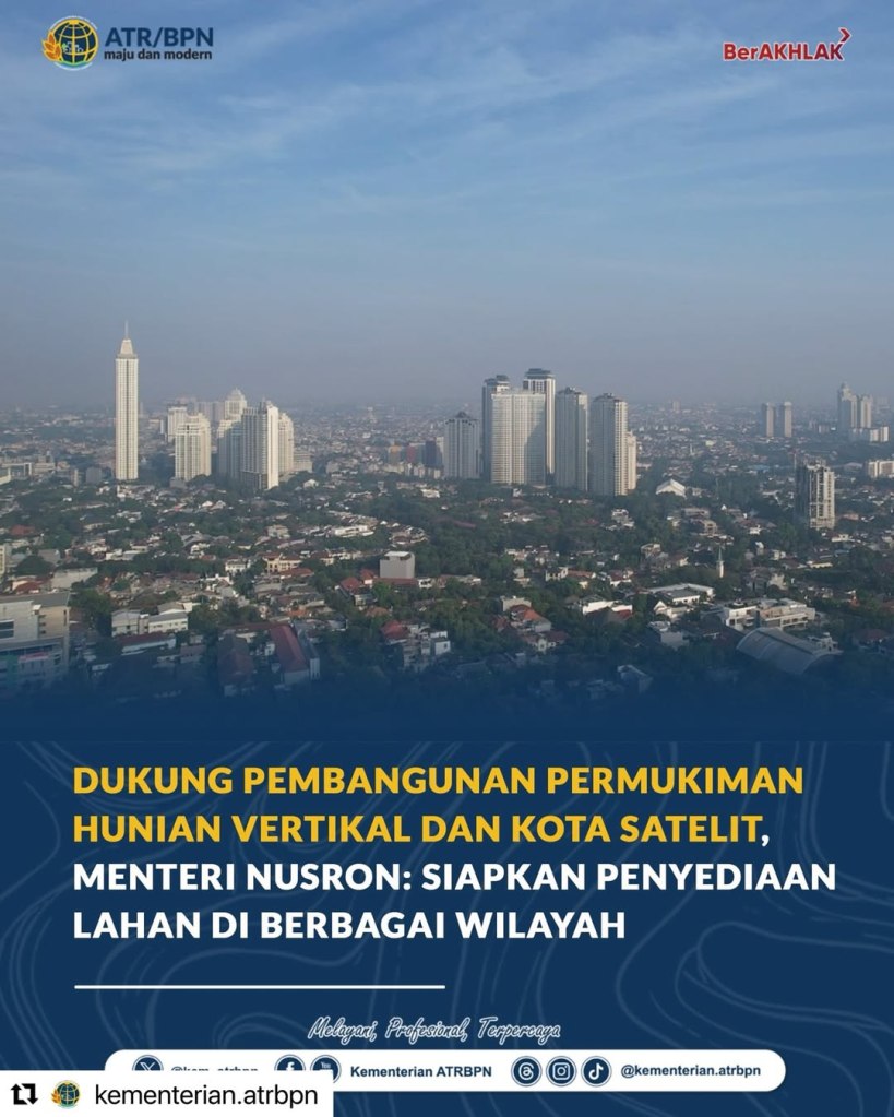 Halo #SobATRBPN, Menteri Agraria dan Tata Ruang/Kepala BPN, Nusron Wahid, menegaskan komitmen Kementerian ATR/BPN dalam mendukung pembangunan hunian vertikal dan kota satelit sebagai bagian dari Proyek Strategis Nasional. Hal ini disampaikan dalam Rapat Koordinasi bersama Menteri Perumahan dan Kawasan Permukiman, Maruarar Sirait, di Jakarta, Kamis (16/04/2026). Kementerian ATR/BPN telah mengidentifikasi lebih dari 129 ribu hektare lahan di berbagai wilayah Indonesia, dengan sekitar 37 ribu hektare dinilai potensial untuk dimanfaatkan. Hunian vertikal diprioritaskan di kawasan perkotaan, sementara pengembangan kota satelit disiapkan sebagai solusi untuk mengurangi kepadatan dan mendorong pemerataan pembangunan. Melalui sinergi lintas sektor, penyediaan lahan ini diharapkan mampu mempercepat pembangunan perumahan serta memberikan manfaat nyata bagi masyarakat, khususnya dalam pemenuhan hunian yang layak. Yuk kunjungi selengkapnya di: https://www.atrbpn.go.id/berita/dukung-pembangunan-permukiman-hunian-vertikal-dan-kota-satelit-menteri-nusron-siapkan-penyediaan-lahan-di-berbagai-wilayah #KementerianATRBPN #MelayaniProfesionalTerpercaya #MajuDanModern #MenujuPelayananKelasDunia