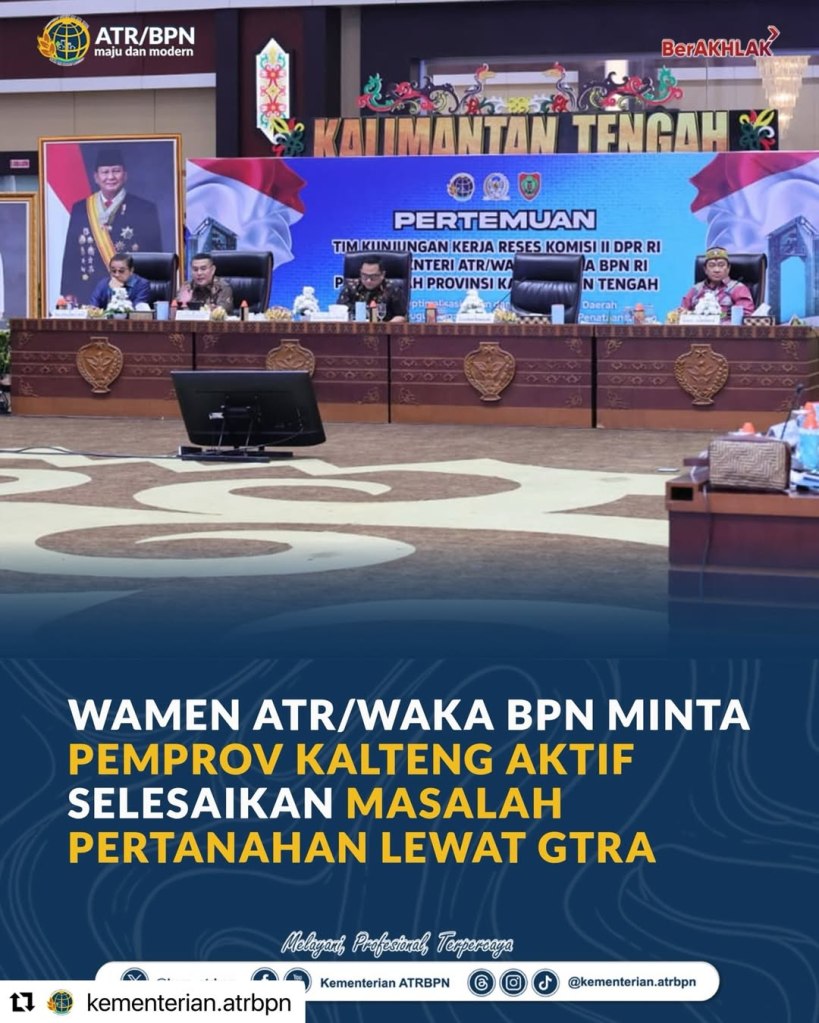 Halo #SobATRBPN, peran aktif pemerintah daerah menjadi kunci dalam menyelesaikan berbagai persoalan pertanahan di wilayahnya. Wakil Menteri Agraria dan Tata Ruang/Wakil Kepala BPN, Ossy Dermawan, mengimbau Pemerintah Provinsi Kalimantan Tengah untuk lebih aktif memanfaatkan Gugus Tugas Reforma Agraria (GTRA) dalam menyelesaikan persoalan pertanahan. Hal tersebut disampaikan dalam Kunjungan Kerja Reses Komisi II DPR RI di Palangkaraya, Kamis (23/04/2026). Melalui optimalisasi GTRA, pemerintah daerah diharapkan mampu mengidentifikasi potensi Tanah Objek Reforma Agraria (TORA), termasuk penyelesaian persoalan masyarakat yang tinggal di kawasan hutan agar memperoleh kepastian hukum atas tanah. Langkah ini penting untuk meningkatkan kesejahteraan masyarakat serta mewujudkan penataan pertanahan yang lebih adil dan berkelanjutan. Yuk simak dan bagikan informasi ini di: https://www.atrbpn.go.id/berita/wamen-atrwaka-bpn-minta-pemprov-kalteng-aktif-selesaikan-masalah-pertanahan-lewat-gtra #KementerianATRBPN #MelayaniProfesionalTerpercaya #MajuDanModern #MenujuPelayananKelasDunia